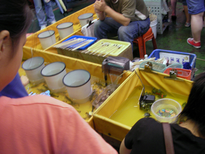 エビ釣りと亀釣り。エビは焼いてくれます。 |